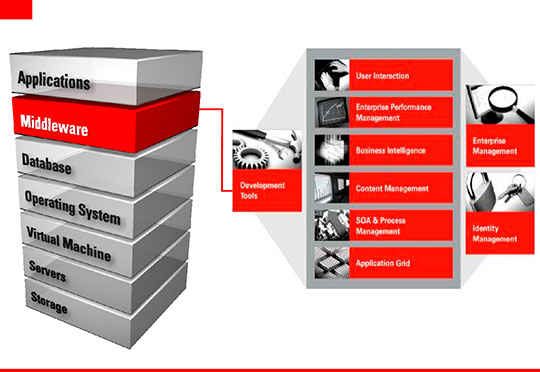 Oracle®, mediante su renovado middleware, ofrece componentes tecnológicos que permiten desarrollar aplicaciones que obtengan el mejor rendimiento del hardware y software. El nuevo middleware de Oracle constituido en su sistema central por un poderoso servidor de aplicaciones Java para aplicaciones empresariales (J2EE), una de las mejores plataformas en el mercado. Oracle® ha puesto a disposición del mercado un framework para desarrollo de aplicaciones de negocio a la medida denominado ADF.